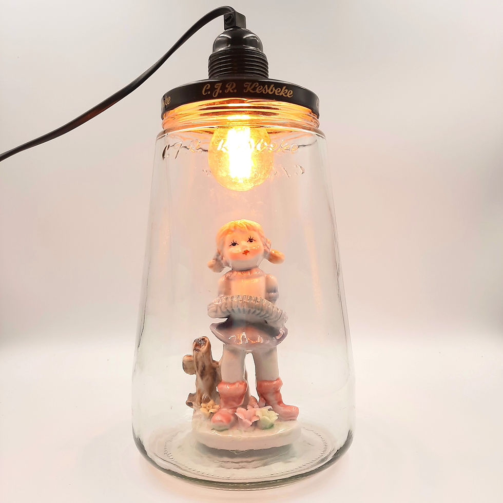 Stoere Kesbekelamp gemaakt van een glazen Kesbekepot met een vintage beeldje erin.